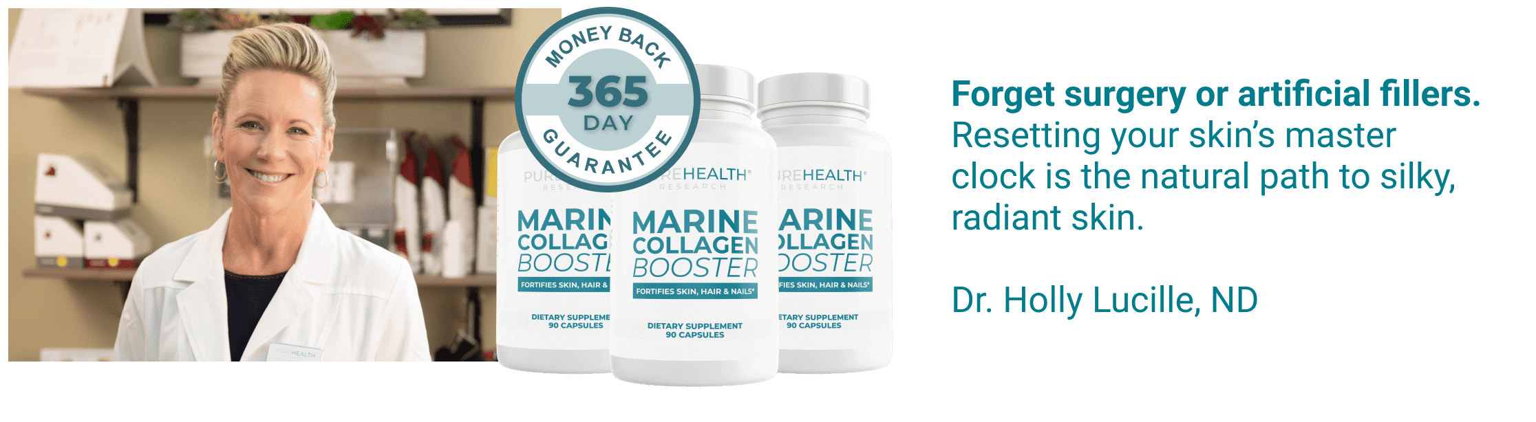MARINE COLLAGEN BOOSTER by PureHealth Research provides professional quality skin care support combining 4 of nature’s most powerful yet 100% natural skin-nourishing ingredients. Doctor-Approved MARINE COLLAGEN BOOSTER supports natural and robust skin, tissue, blood vessel, muscle & joint, gut lining, and immune system rejuvenation by rewinding the clock on aging tissues before long-term damage can get a foothold.